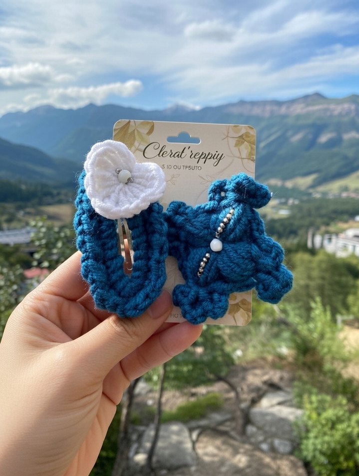 Turkuaz Örgü Çiçekli Çocuk Toka Seti