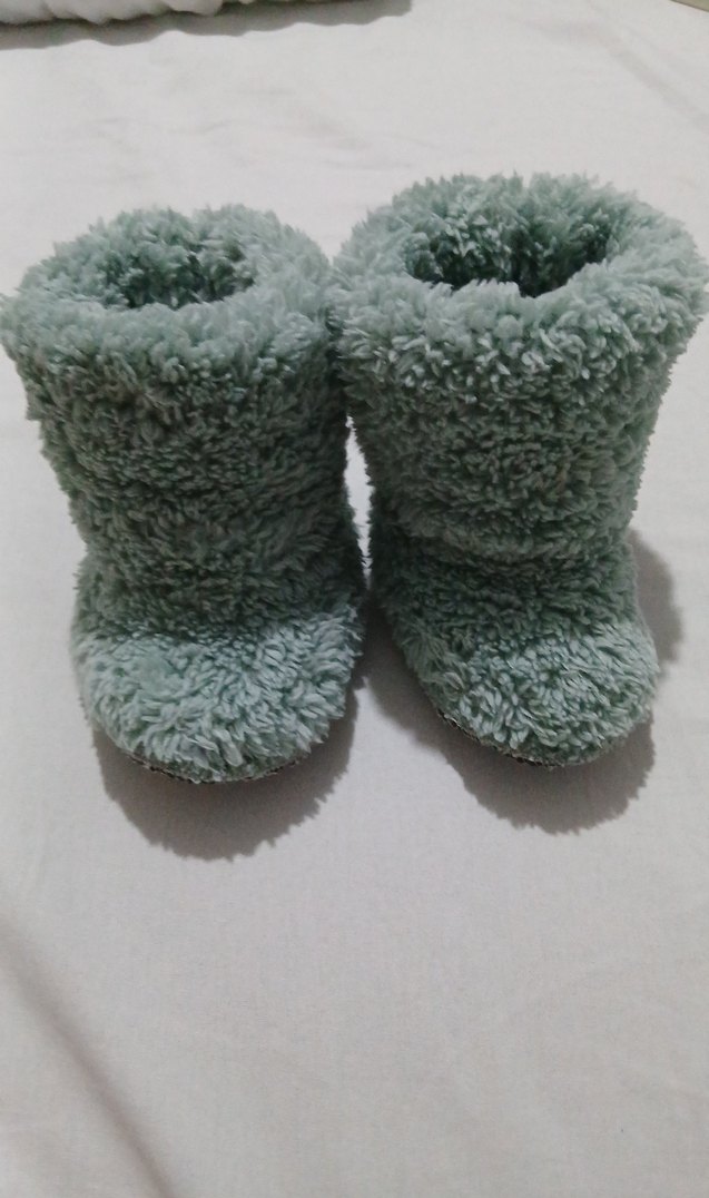 Yumuşak ve sıcak kumaştan, düz tasarımlı turkuaz örgü erkek bebek pandufu. 6-12 ay