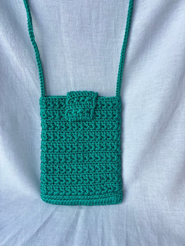 Yumuşak örgüden yapılmış, sade ve renkli bohem tarzda turkuaz örgü çapraz kadın çantası, günlük kullanım için uygun.