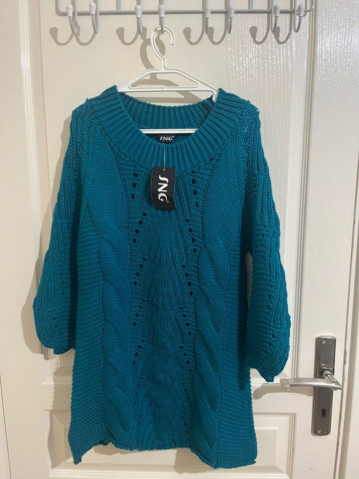 Koyu turkuaz renkli, yarım kol yuvarlak yakalı örgü kadın kazak. Rahat kesimi ve midi uzunluğu ile konforlu bir seçim.