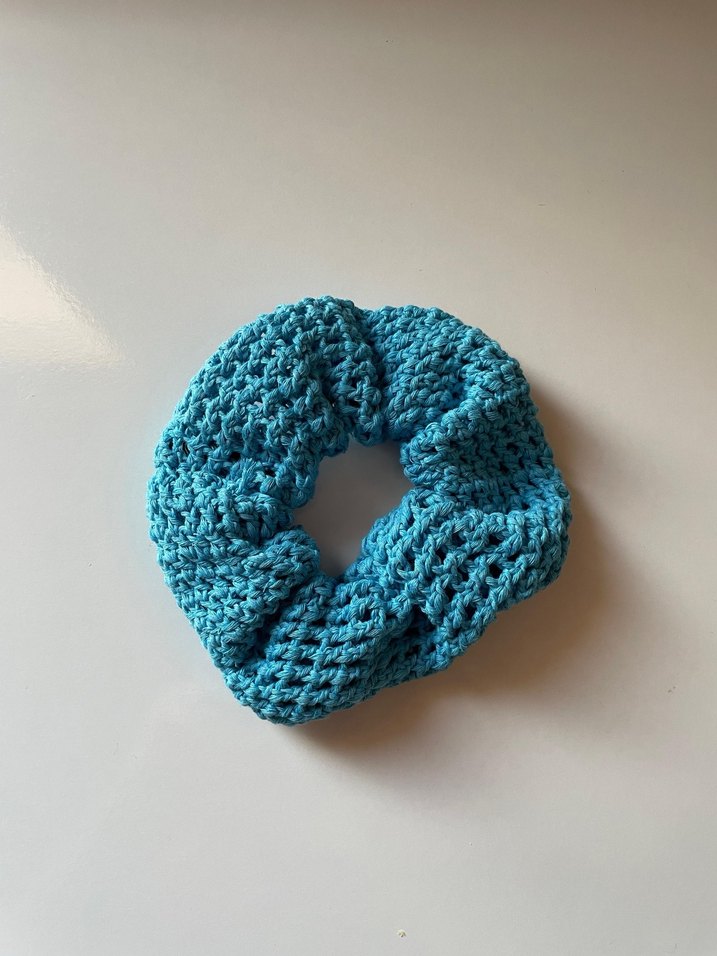 Turkuaz renkte, yumuşak örgü kumaştan yapılmış, rahat ve bohem tarzda kadın saç tokası.