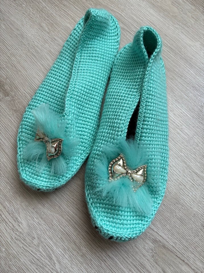 Turkuaz örgü kadın terlik, kama topuklu, fiyonk ve yumuşak kumaş detaylı. Günlük kullanım için rahat ve sıcak.