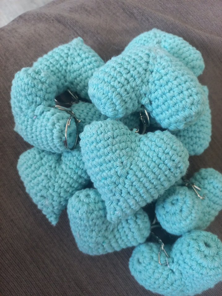Turkuaz renkli, örgü kalp şeklinde anahtarlıklar, rahat ve bohem tarzıyla anahtarlarınıza yumuşaklık katıyor.