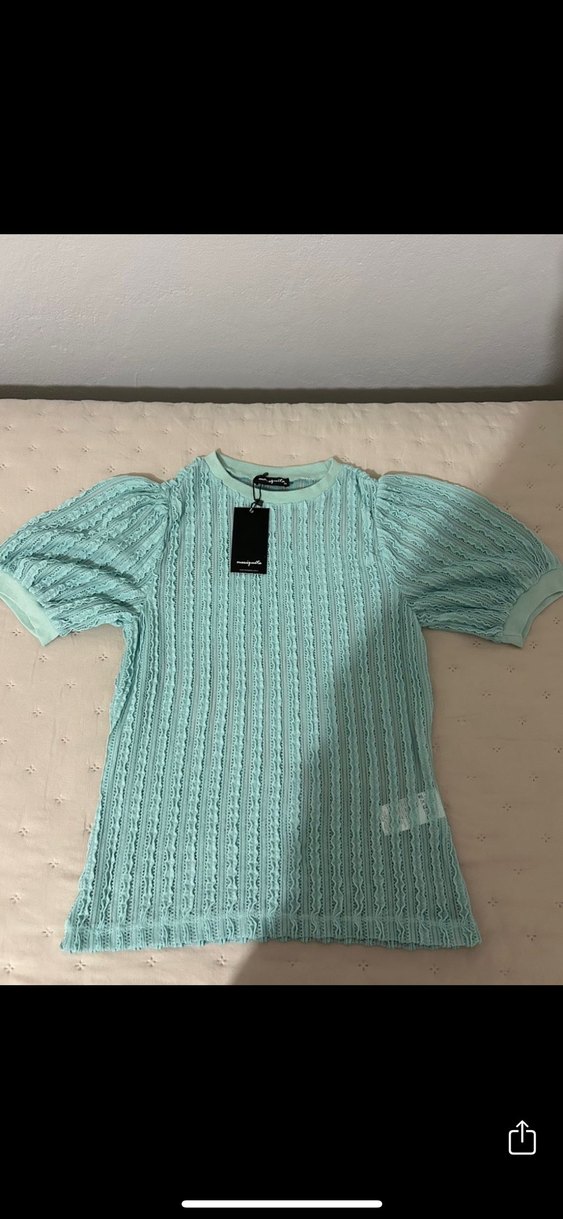 Turkuaz renkli, kısa balon kollu, fitted kesim ve bisiklet yaka tshirt.Günlük rahat sokak stiline uygun, normal boyda bir parça.