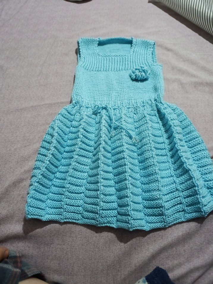 Turkuaz renkli, kolsuz örgü kız çocuk elbisesi, bol kesim ve yuvarlak yaka. Düz renk, dokulu etek ve göğüste süs detayı bulunur. yenidr hiç giyilmedi.