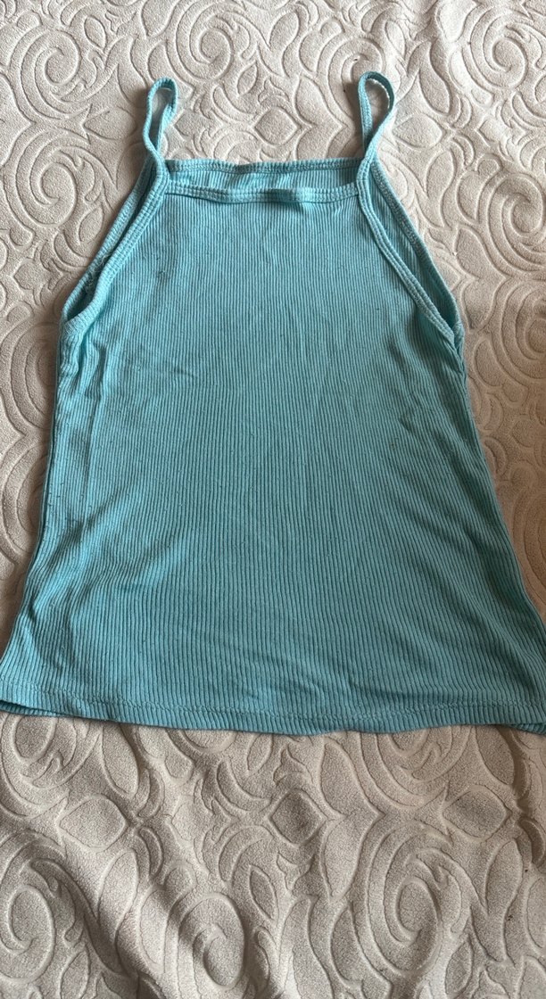 Turkuaz renkli, yüksek yakalı örme kadın atlet. Yumuşak sentetik kumaştan, günlük kullanıma uygun sade ve rahat bir model.