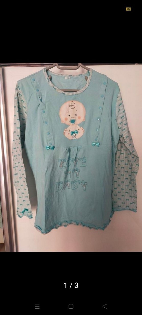 Pamuklu, turkuaz renkli, uzun kollu ve yuvarlak yaka hamile tişörtü. Bebek baskısı ve dantel detaylarıyla rahat kesim.
