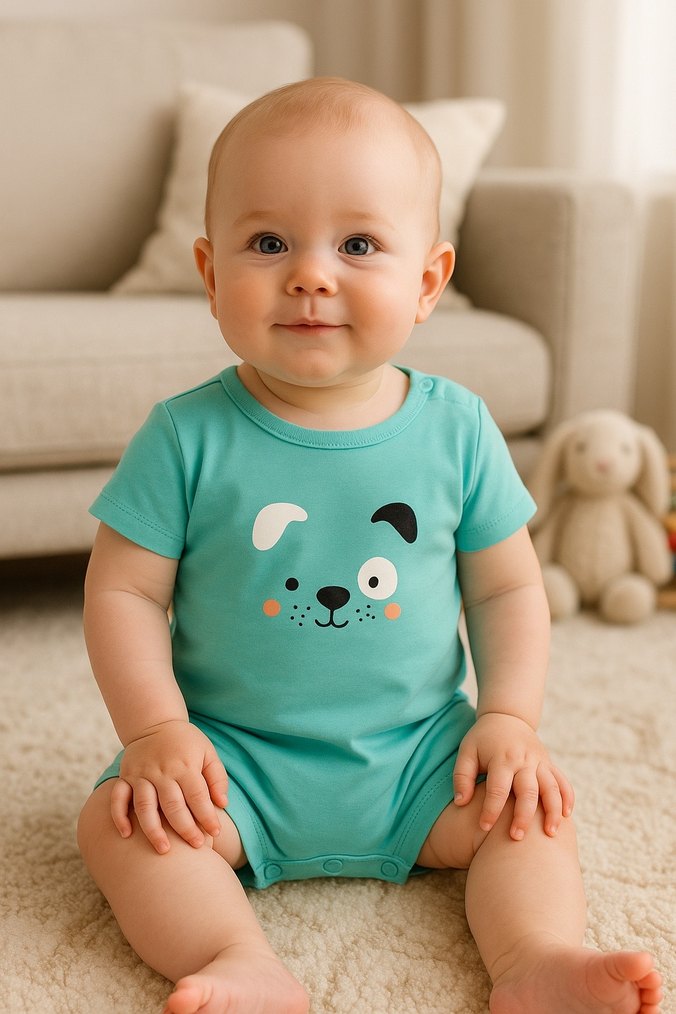 Turkuaz kısa kollu erkek bebek body, yuvarlak yaka ve sevimli baskılı köpek yüzü ile. Pamuklu, kabarık kollu rahat tasarım. MARKA TEMSİLİDİR 6-9 AY