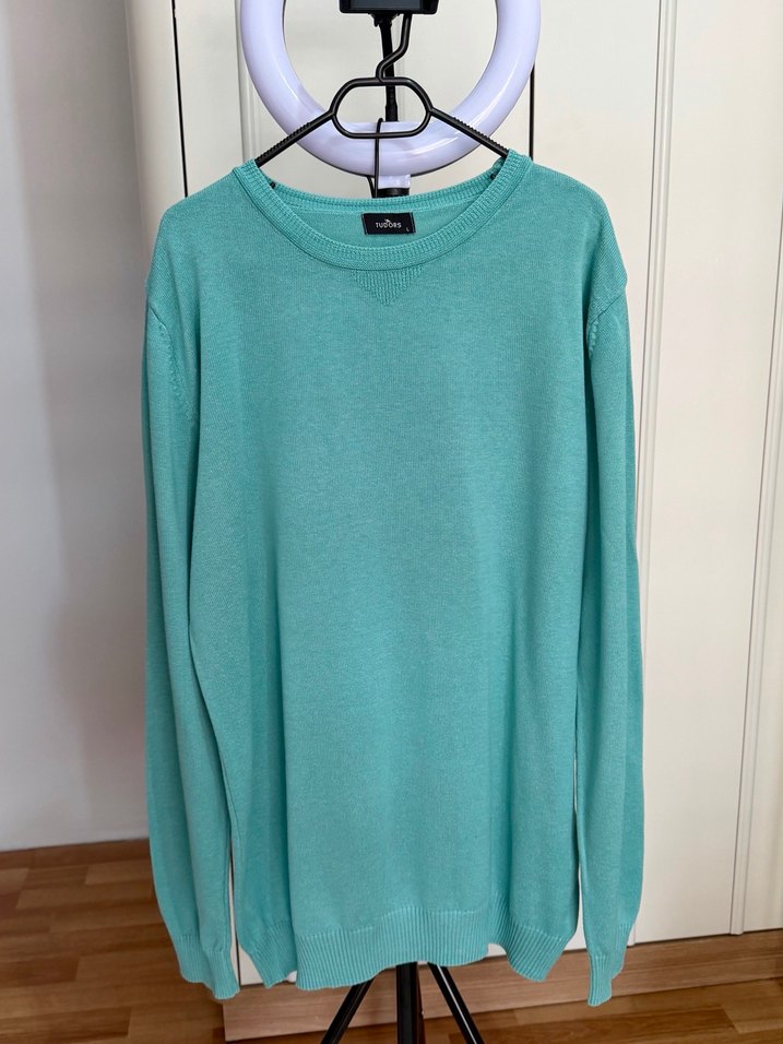 Turkuaz renkli, yuvarlak yakalı ve uzun kollu erkek kazak, pamuklu yumuşak kumaştan, rahat ve bol kesimlidir. Günlük kullanıma uygun, sade ve şık bir tasarıma sahiptir.