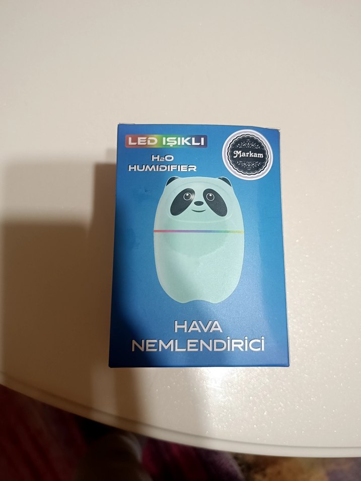 Turkuaz renkli, panda figürlü ve LED ışıklı hava nemlendirici. Ortam havasını nemlendirir ve hoş bir ışık sağlar. Çalisip çalışmadığı kontrol edildi sadece.