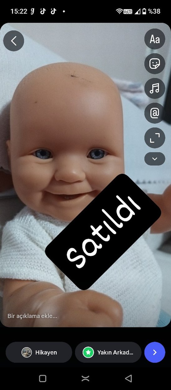 Gülümseyen yüzlü, mavi gözlü bebek oyuncak, beyaz örme üst ve pastel turkuaz pantolon giymektedir. Yumuşak, çocuk dostu tasarıma sahiptir.