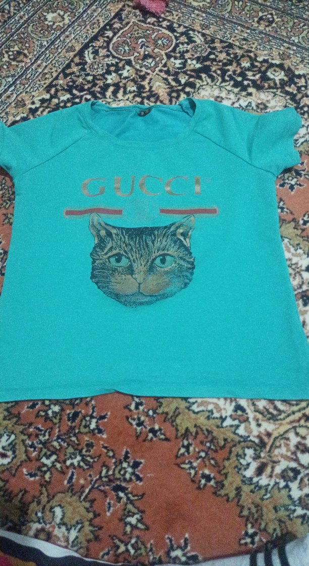 Turkuaz renkte, parlak baskılı Gucci logosu ve kedi yüzü detaylı sokak tarzı kedi tişörtü. Rahat ve şık kullanım sağlar.