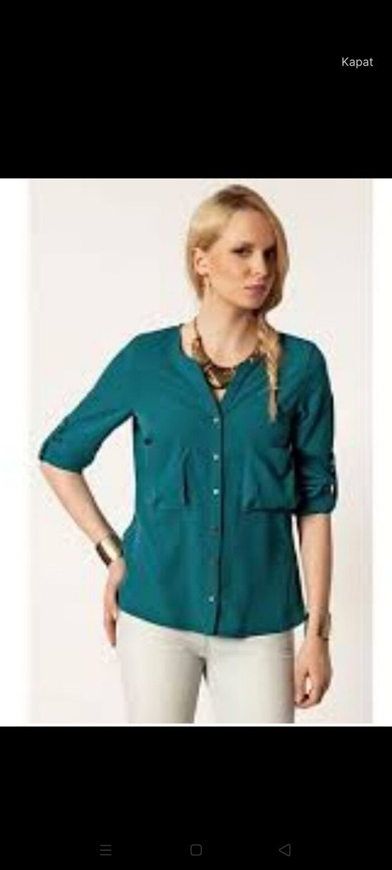 Turkuaz renkli, parlak sentetik kumaştan, düğmeli, uzun kollu, yakalı, bol kesim kadın gömleği. Günlük kullanıma uygun, çağdaş stile sahip midi boyda.