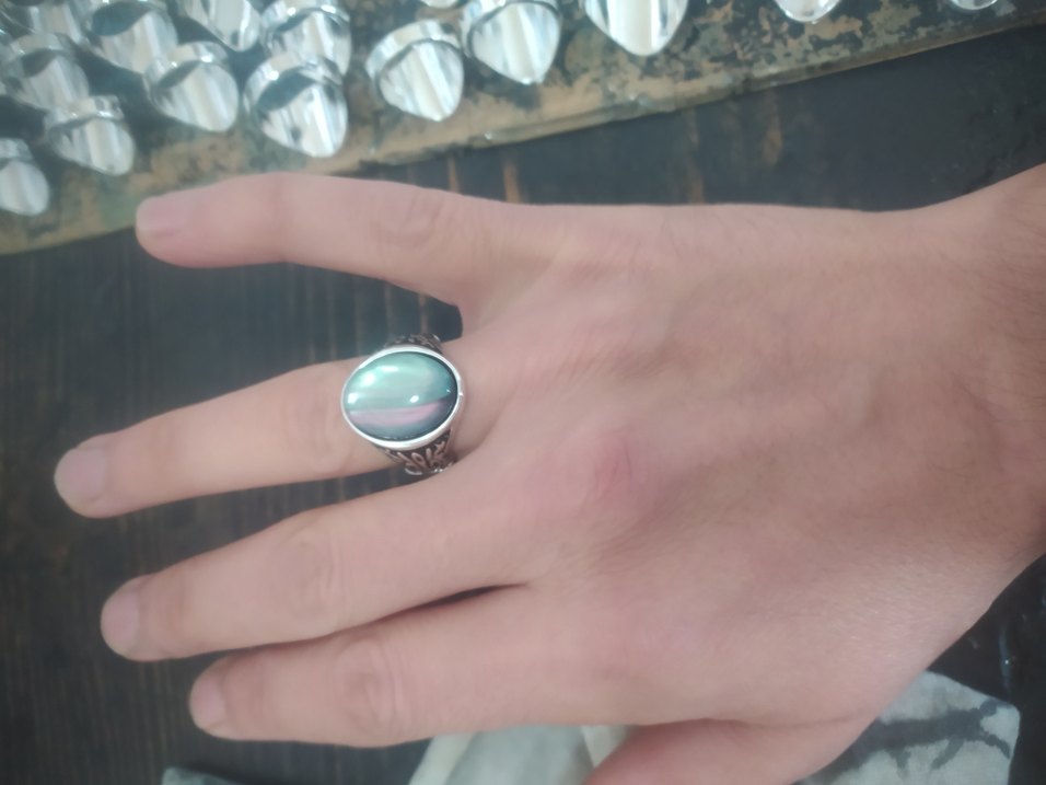 Parlak turkuaz taşlı, bohem ve retro tarzda erkek yüzüğü. Oyma detaylı gümüş bant ile hippie havası taşıyan tasarım.