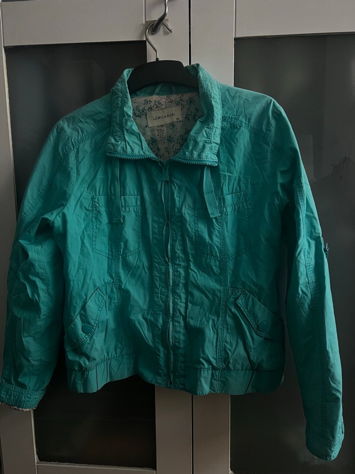 Turkuaz renkli, parlak keten kumaştan yapılmış, fermuarlı, uzun kollu ve notalı yaka detaylı bol kesim kadın ceket. Günlük sokak stili için uygundur.