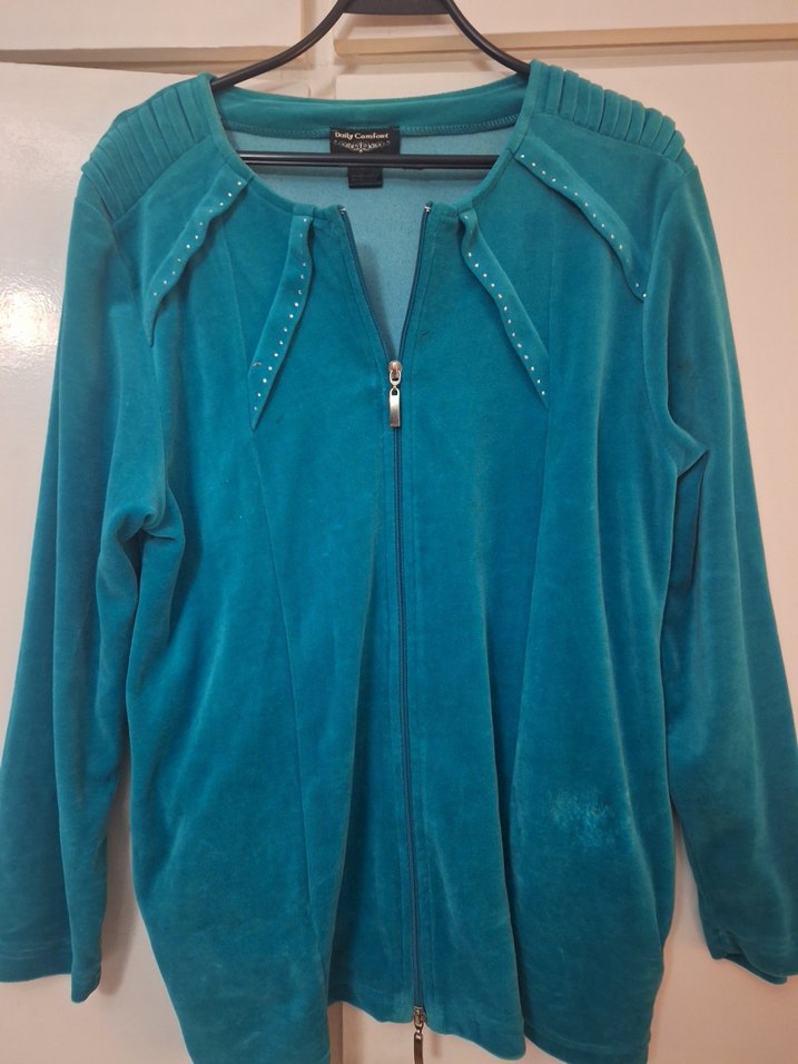 Turkuaz renkli, parlak görünümlü, uzun kollu, fermuarlı ve yaka detaylı kadın ceketi. Yumuşak ve rahat dokusuyla günlük kullanıma uygundur. Lacivert ve siyah pantolon ve eşofman altı ile uygundur kombinler oluşturulabir.Kadife görünümlü olup polyester ve ağaç yünü karışımı içerir. Boyu 72 cm, iki göğüs arası 40 cm,bel ölçüsü 48 cm dir.