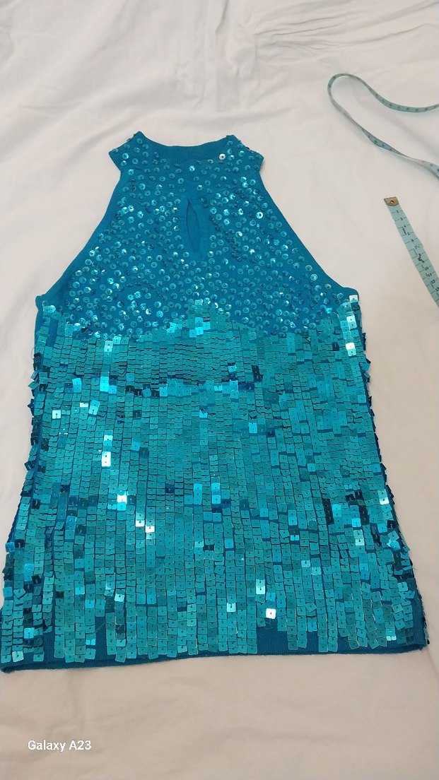 Kolsuz, V yakalı turkuaz gece elbisesi, parlak payetlerle süslenmiş ve bohem tarzda, gösterişli partiler için uygun. bir kaç pulu dusmüş ama çok şık ve harika duruyor üstte