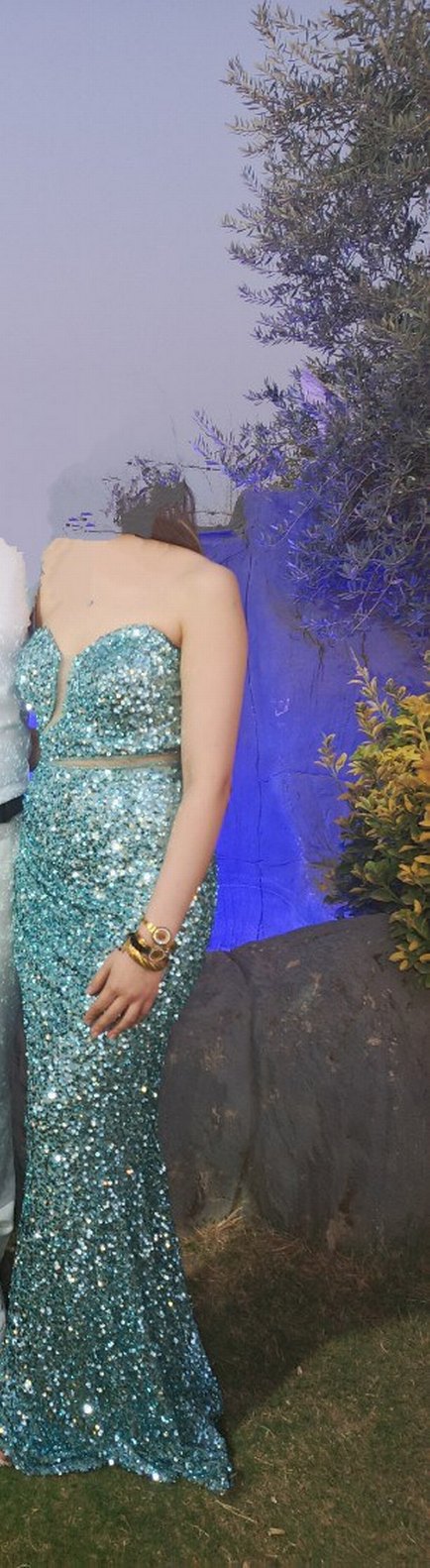 Turkuaz renkli, payetli ve yılan desenli straplez uzun elbise, vücuda oturan kesimi ve kolsuz yapısıyla modern ve göz alıcı bir tarz sunar. ✨