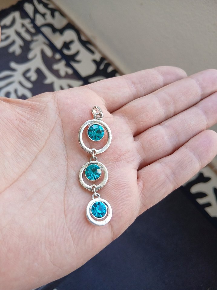 Üç parlak taşın turkuaz renkli halkalar içinde yer aldığı, bohem tarzda kadın charm. Minimalist ve retro dokunuşlu, günlük kullanıma uygun.