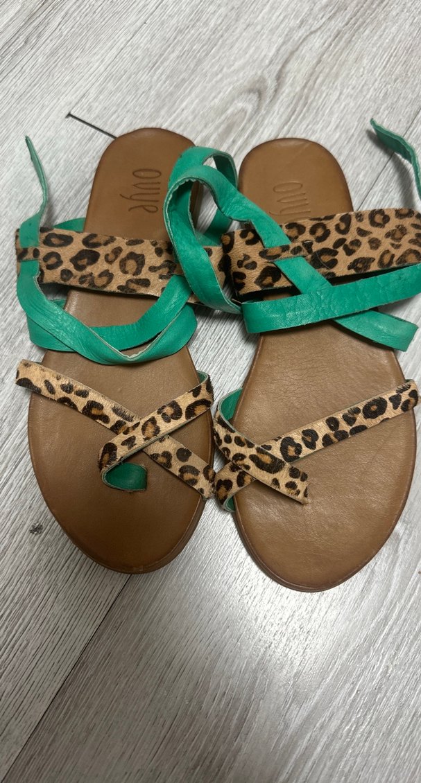 Turkuaz parlak bantları yılan ve leopar desenli, dolgu topuklu kadın sandalet. Tokalı ve kauçuk malzemeden, günlük kullanıma uygun.