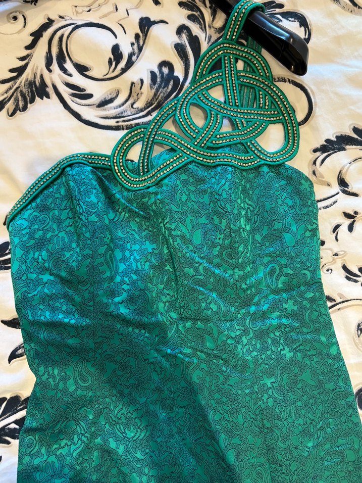 Parlak turkuaz yılan desenli, drapeli ve askısız uzun abiye, bohem tarzı yansıtır. Kolsuz ve vücuda oturan kesimiyle partiye uygundur.
