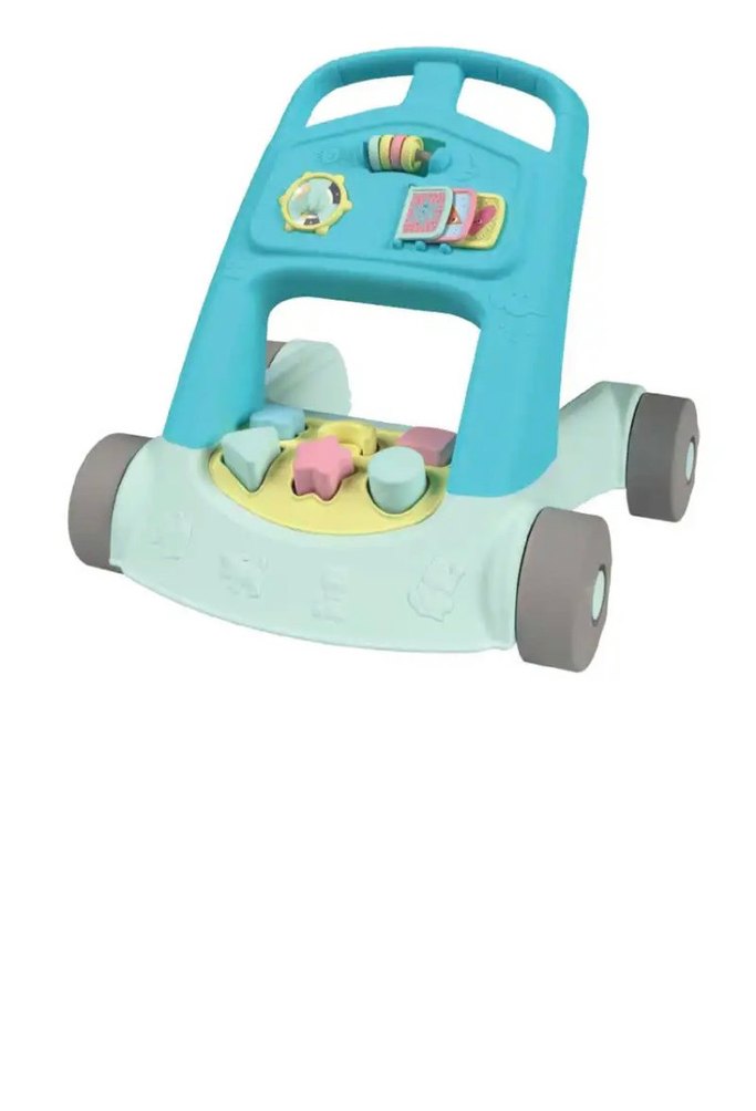 Turkuaz pastel renkte, sağlam tutamağa sahip ve ön panelinde etkileşimli oyun öğeleri bulunan bebek yürüteci. Yürümeyi destekler.