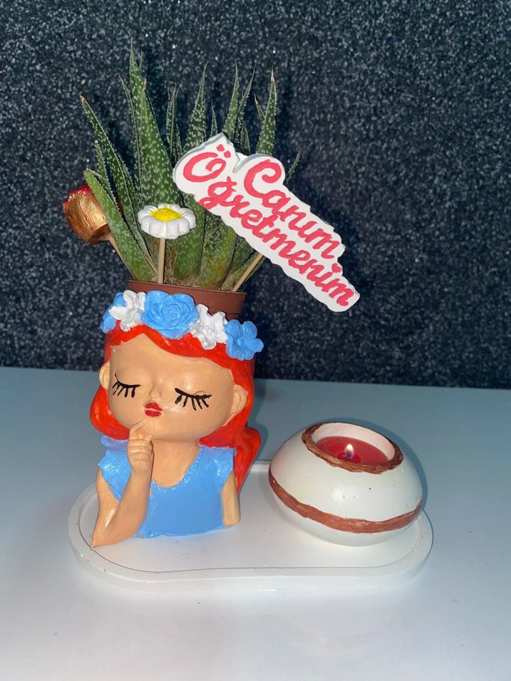 Küçük sukulent bitkisi ve mumluk içeren turkuaz pastel figür saksı. Kız figürü üzerinde "Canım Öğretmenim" yazısı bulunur.