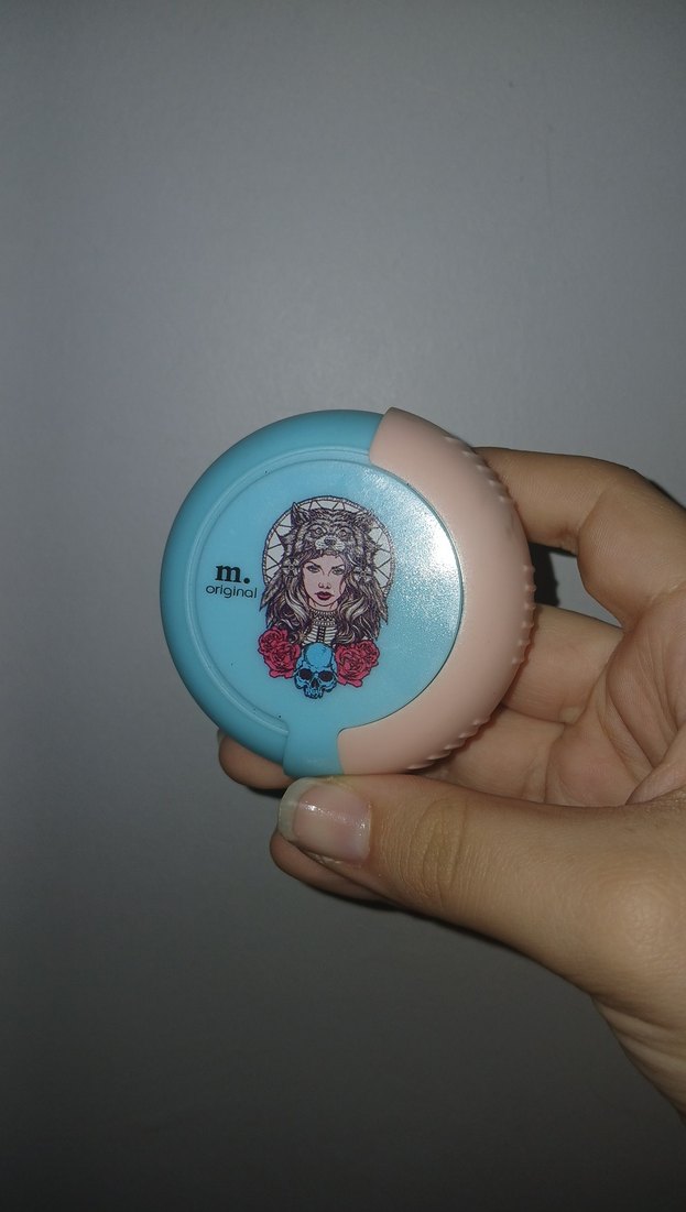Turkuaz pastel renkte, kapağında sanat eseri desenli 'm.' logolu pudra. Makyajda pürüzsüz bir bitiş sağlar.