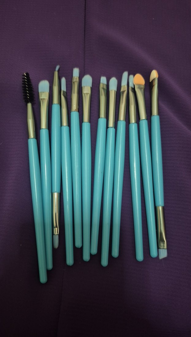 Çeşitli fırça uçlarına sahip turkuaz pastel makyaj fırça seti. Yumuşak saplar ve metal tutucular içerir. ️