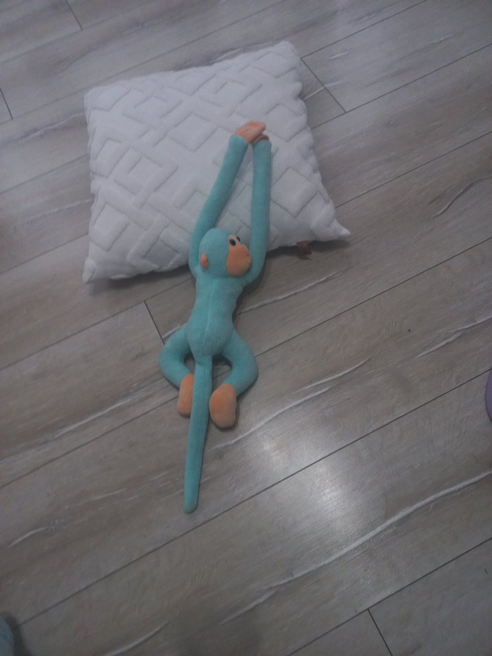 Pastel turkuaz renkte uzun kollu ve bacaklı peluş maymun oyuncak. Yumuşak dokulu, elleri, ayakları ve yüzü şeftali tonlarında.