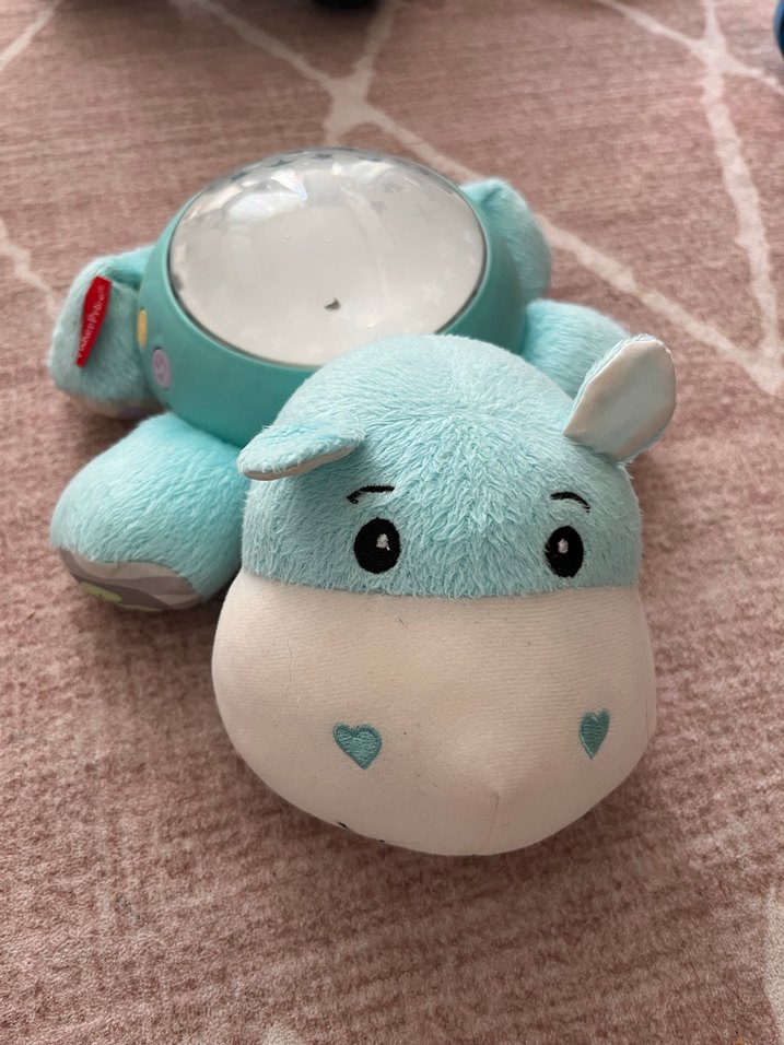 Fisher price markalı hiç bir sıkıntısı yok hem müzik çalıypr hemde gece lambası görevi görüyor tavana yıldızlrı yansıtıyor Nakışlı kalp detaylı, yumuşak turkuaz pastel peluş hipopotam oyuncak, sırtında şeffaf kubbe ile. Rahat ve sevimli bir arkadaş.
