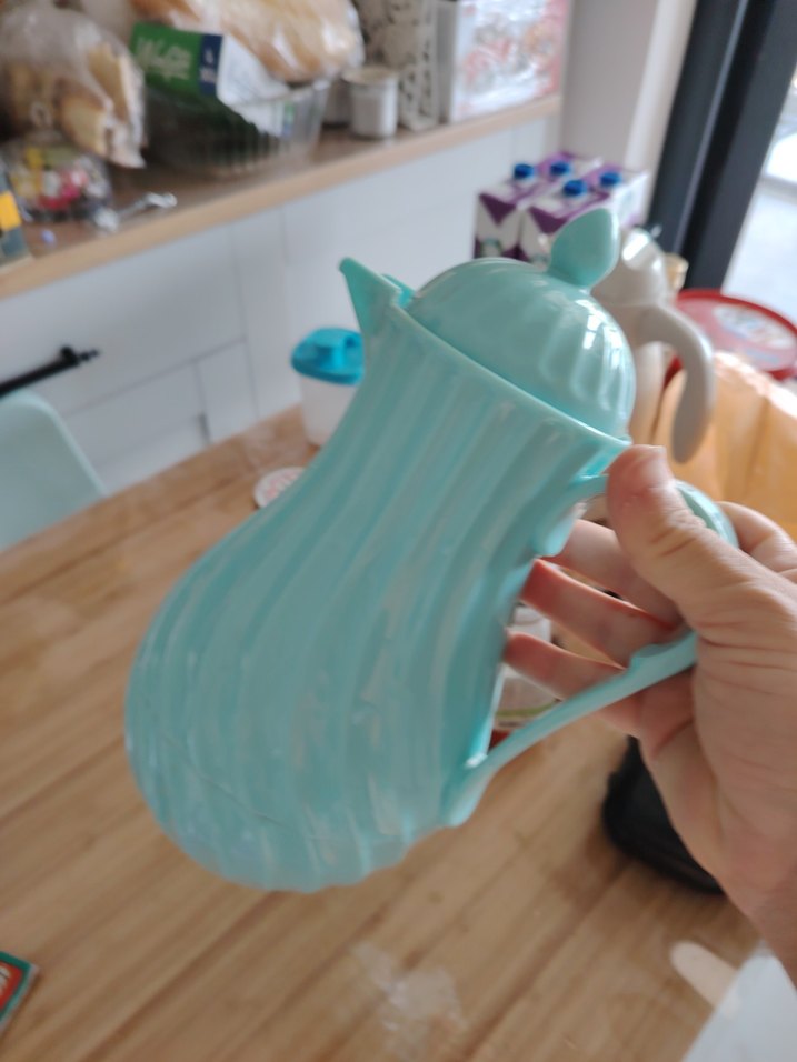 Turkuaz pastel renkte, kapaklı ve saplı, içecekleri sıcak tutmaya uygun termos