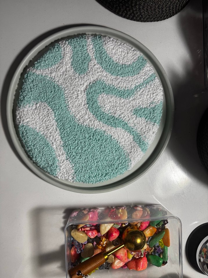 Pastel turkuaz ve beyaz tozla hazırlanmış soyut desenli dekoratif yuvarlak punch. Toz dokusu sanatsal bir görünüm sunar.