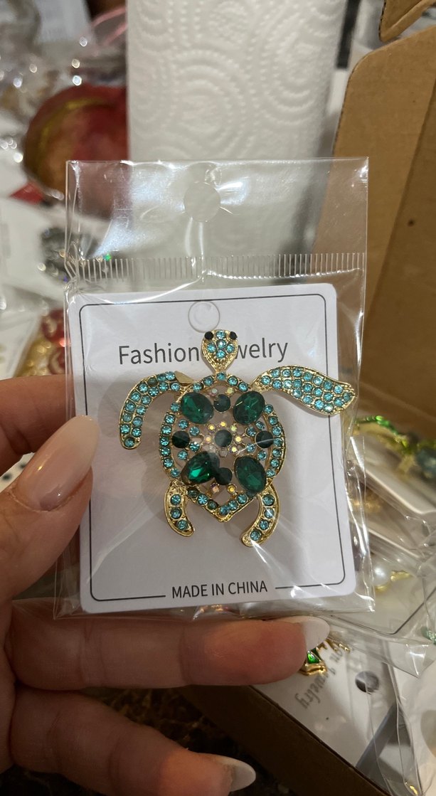 Turkuaz renkte, payetli kaplumbağa şeklinde, baskılı desenli bohem ve gösterişli tarzda günlük kullanım için broş. Çin malı.