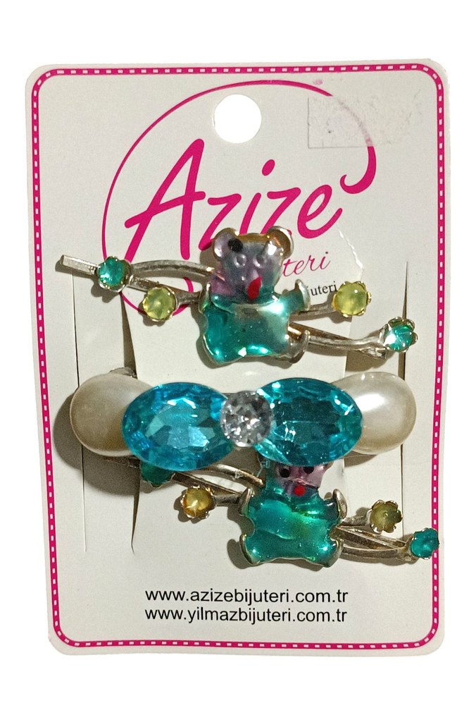 TEKLİF KABUL EDİLMEYECEK Turkuaz renkli, payetli ve renkli desenli çocuk saç tokası seti. Bohem ve retro tarzda, küçük taşlar ve ayıcık figürleri ile süslenmiştir.