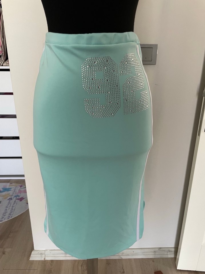 Turkuaz renkli, payet detaylı, baskılı ve sentetik kumaştan yapılmış uzun, dar kesim eteği. Spor ve sokak stili için uygundur. ✨