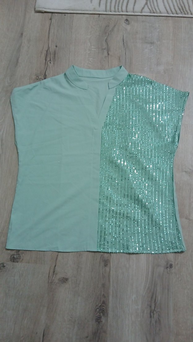 Turkuaz renkli, V yaka ve kolsuz bluz. Bir tarafı parlak payetlerle süslenmiş, normal midi boyda ve bol kesimdir. Günlük rahat kullanıma uygundur. ✨