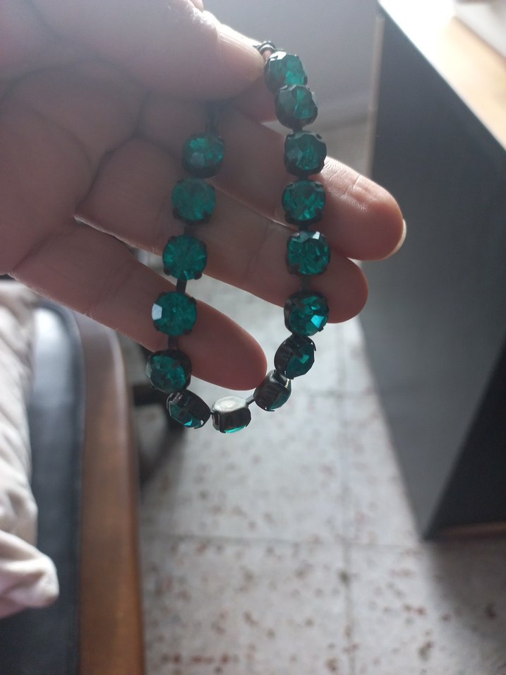 Kadın bileklik, koyu turkuaz payet taşlarla yılan deseni oluşturarak günlük kullanıma uygun bohem ve gösterişli bir tarz sunar.