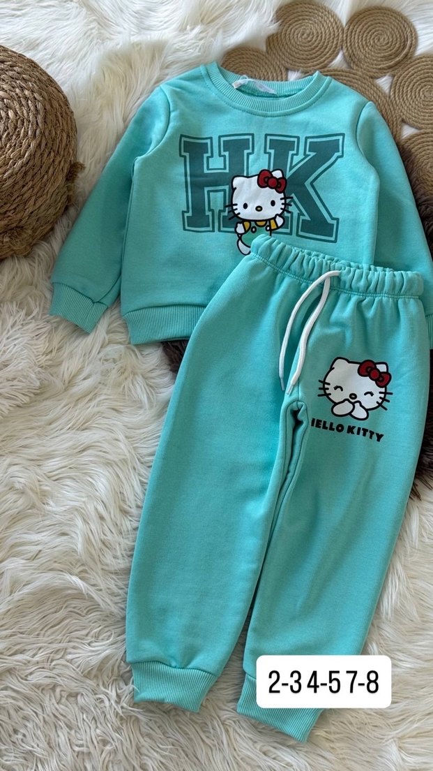 Turkuaz renkli, bol kesim kız eşofman takımı, uzun kollu ve bisiklet yaka. Yumuşak peluş kumaştan, peluş detaylı ve baskılı Hello Kitty desenli. 2-3 4-5 7-8 yaşlar vardır