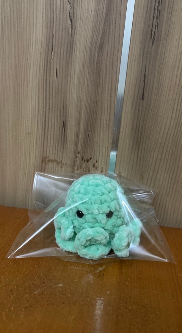 Yumuşak dokulu, küçük siyah gözlü, pastel turkuaz renkte peluş ahtapot oyuncak.