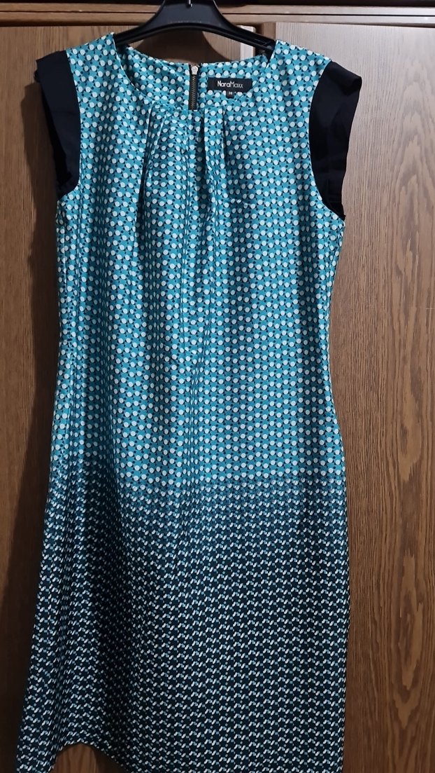 Kolsuz, yüksek yakalı ve normal kesimli turkuaz pilili midi elbise. Sentetik kumaştan, koyu renkli batik desenli, bohem ve retro tarzı yansıtır. Günlük iş kullanımı için uygun. Arkada fermuarı var. Küçük bir yırtmaç bulunuyor. Ölçüleri: Boy(omuzdan): 96 cm, boy(koltuk altından): 73cm, genişlik (koltuk altından ölçüm): 43 cm