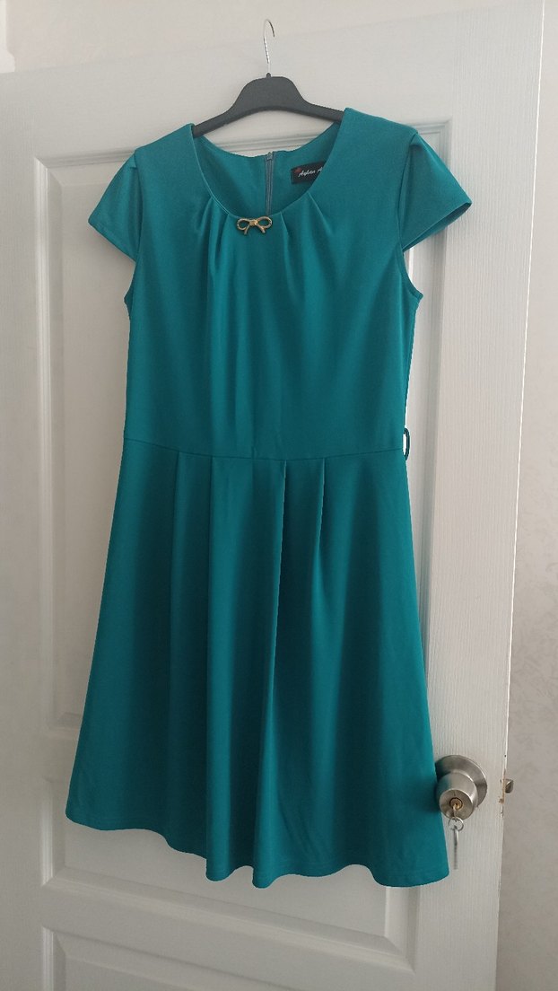 Turkuaz renkli, kısa kollu, yuvarlak yakalı elbisesi. Pilili etek detayı ve parlak kumaşıyla modern klasik tarzda, ofis için uygundur.