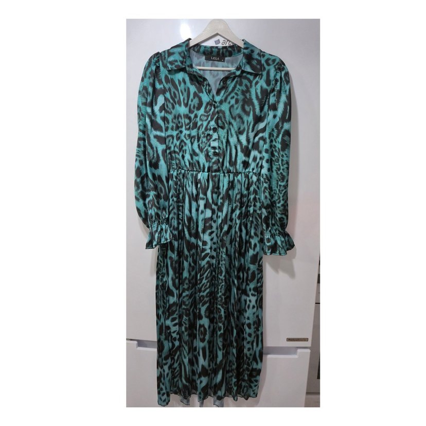 Turkuaz renkli, pilili midi boy elbise, gömlek yaka yakalı ve uzun kolludur. Yumuşak sentetik kumaştan, bol kesim batik desene sahiptir.