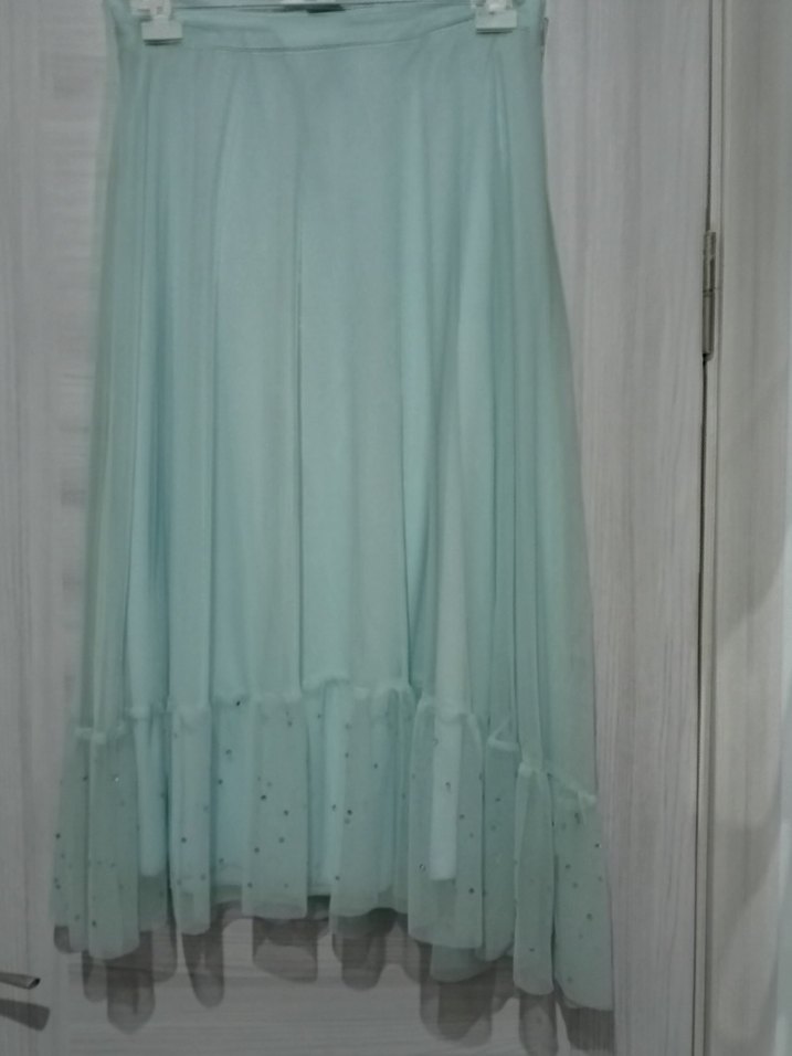 Turkuaz renkte, pilili ve bol kesim uzun kadın eteği. Yumuşak sentetik kumaştan, minimal tarzda, puantiyeli etek ucu detaylı, düğün için uygun.