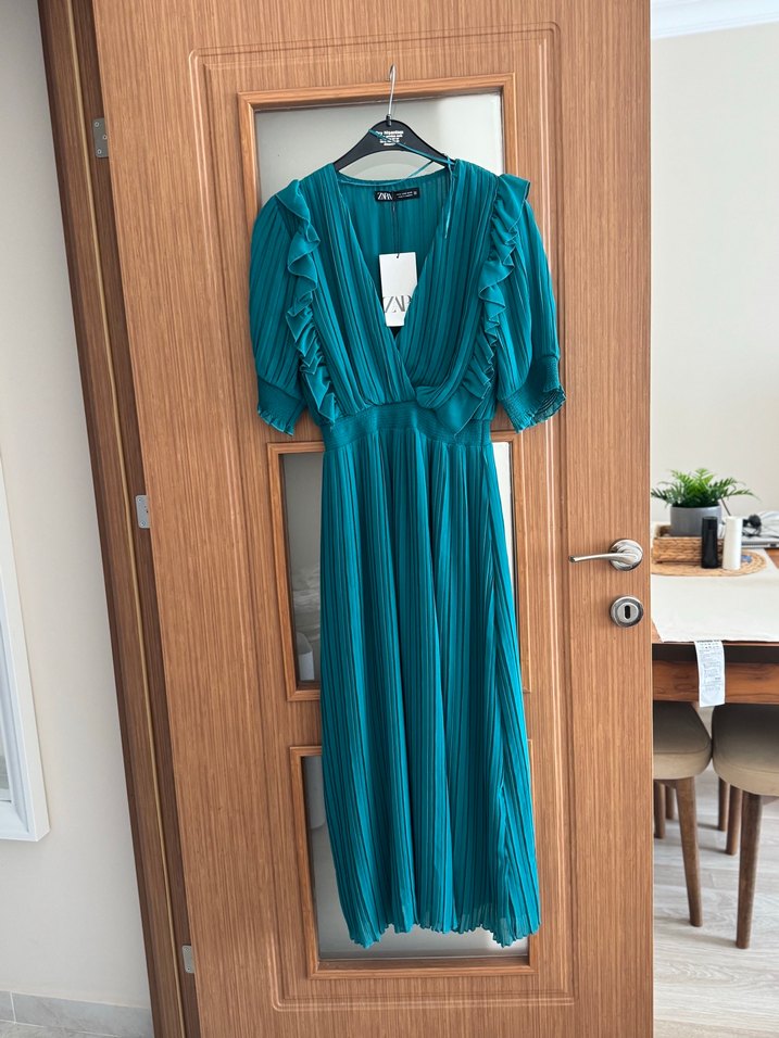 Turkuaz renkli, piliseli kumaştan yapılmış, bol kesim ve V yaka uzun elbise. Kısa kollu, minimal bohem tarzda, yumuşak sentetik kumaş.
