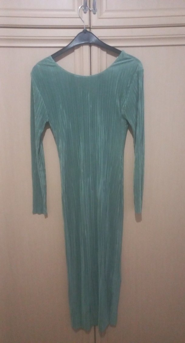Dar kesim, piliseli sentetik kumaştan yapılmış uzun kollu elbise. Yuvarlak yakalı, pastel turkuaz rengiyle şık bir parti görünümü sağlar.