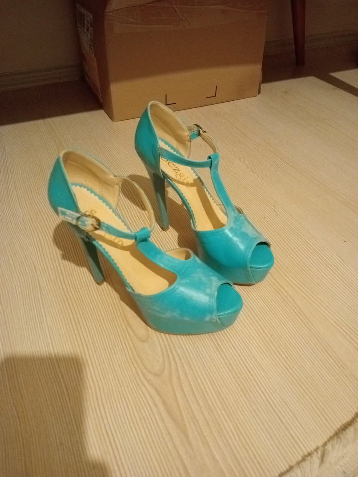 Turkuaz platform topuklu, tokalı ve kauçuk malzemeden yapılmış kadın ayakkabısı. Pastel tonlu, vintage esintili, günlük kullanım için uygun.boyaya ihtiyaç var