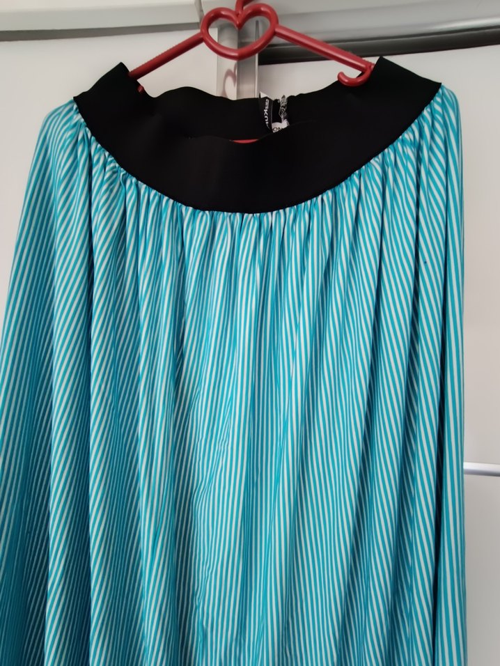 Turkuaz renkli, sentetik kumaştan, pliseli ve bol kesim uzun etek. Canlı rengi ve tarzıyla avant-garde sokak modasına uygundur.