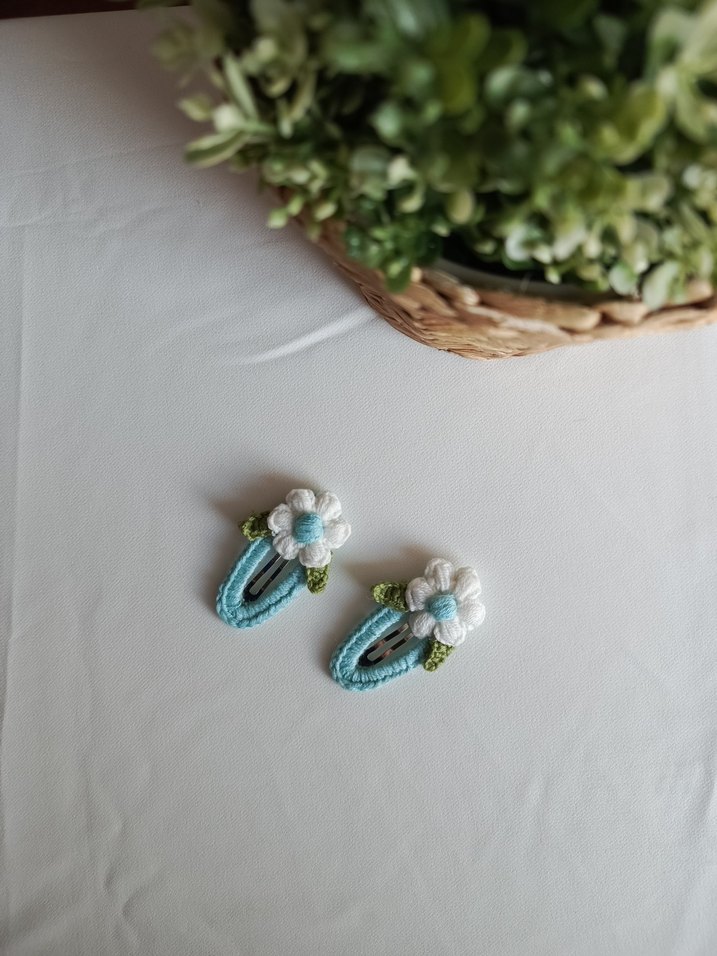 Turkuaz renkli, beyaz nakışlı çiçek ve boncuk detaylı çocuk tokası. Pastel bohem tarzında sade ve şık tasarım.