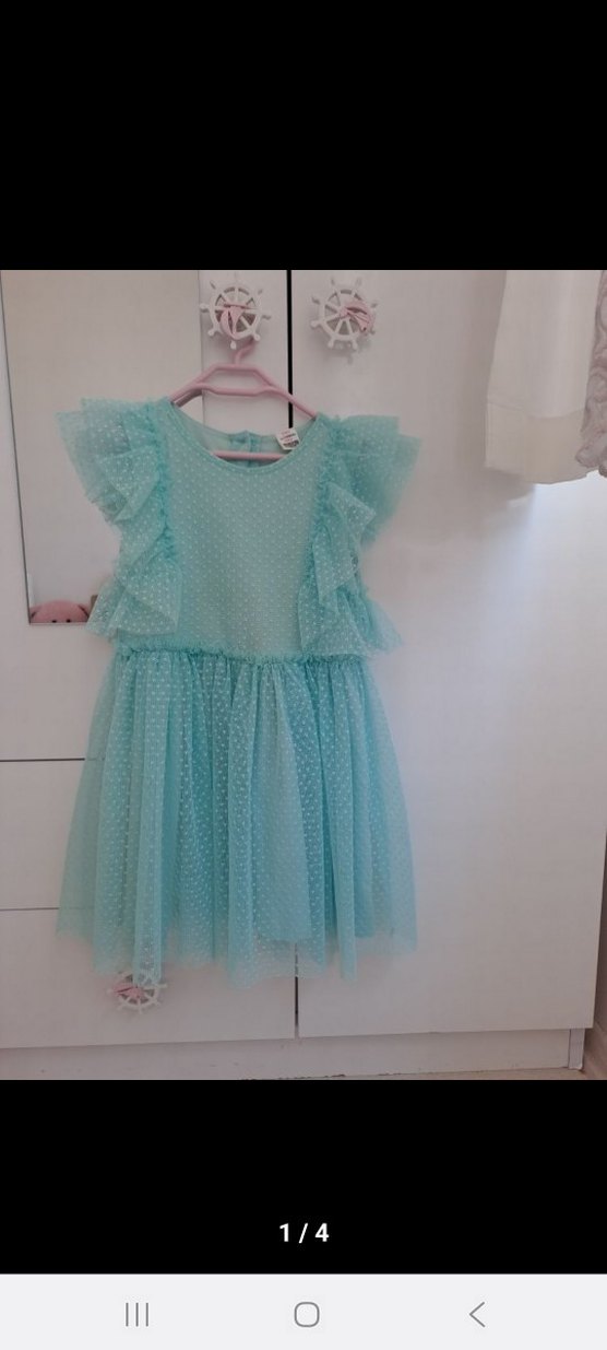 Turkuaz renkli, puantiyeli ve fırfırlı detaylara sahip, kolsuz ve bol kesim kız elbisesi. Yumuşak örme kumaştan, yuvarlak yakalı, bohem tarzda.